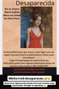 Maria Isabela sumiu em Altos; família suspeita fuga e irmão divulga informações no Instagram