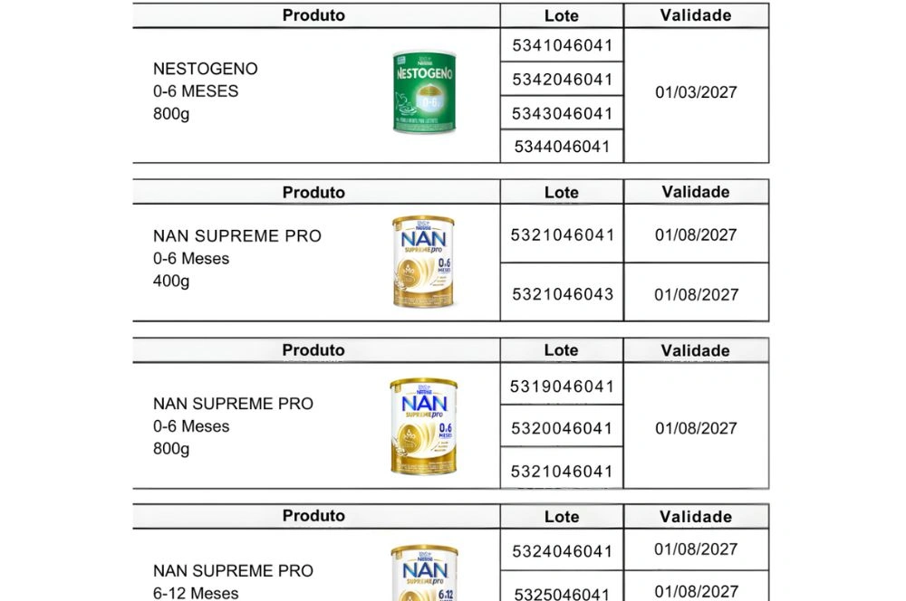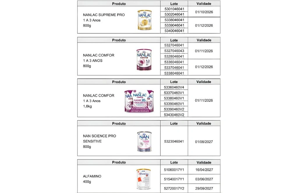 Entre os produtos afetados estão fórmulas das marcas Nestogeno, Nan Supreme Pro, Nanlac Supreme Pro, Nanlac Comfor, Nan Sensitive e Alfamino, todas fabricadas pela empresa Nestlé Brasil Ltda. A decisão foi tomada após a identificação do risco de contaminação por cereulide, uma toxina produzida pela bactéria Bacillus cereus.