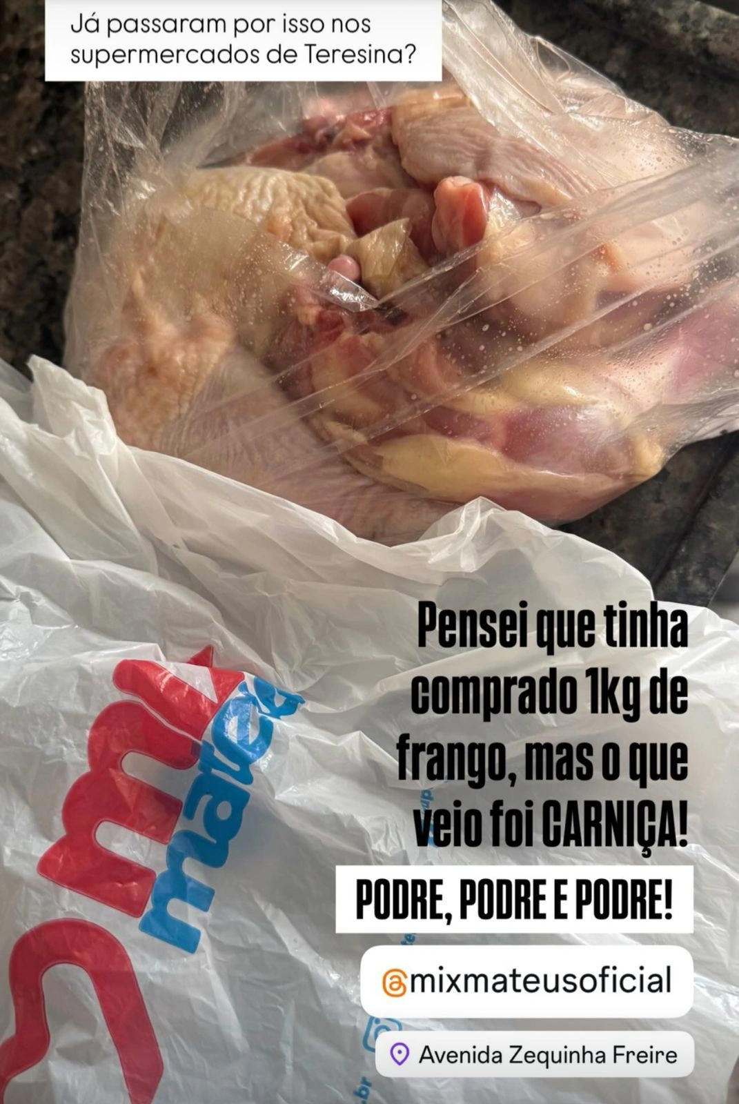 Um cliente denunciou ter comprado carne estragada em uma unidade do supermercado Mix Mateus, em Teresina. O caso ocorreu nesta segunda-feira(22/12), quando o consumidor adquiriu cerca de 1 kg de frango e, ao chegar em casa, percebeu que o produto estava totalmente impróprio para consumo, com forte odor de carniça.