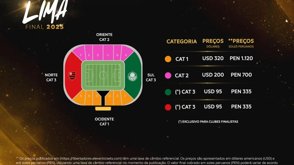 A CONMEBOL iniciou nesta terça-feira (4) a venda geral de ingressos para a grande final da Copa Libertadores 2025, que colocará frente a frente Palmeiras e Flamengo. O confronto entre os dois gigantes brasileiros será disputado no dia 29 de novembro, no Estádio Monumental de Lima, no Peru, com expectativa de casa cheia e forte presença das duas torcidas.
