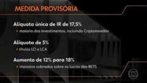 O conjunto de medidas foi enviado ao Congresso por meio de uma medida provisória e aguarda análise. Entre outros pontos, o texto prevê aumento da tributação sobre bets e cobrança de Imposto de Renda sobre investimentos atualmente isentos.