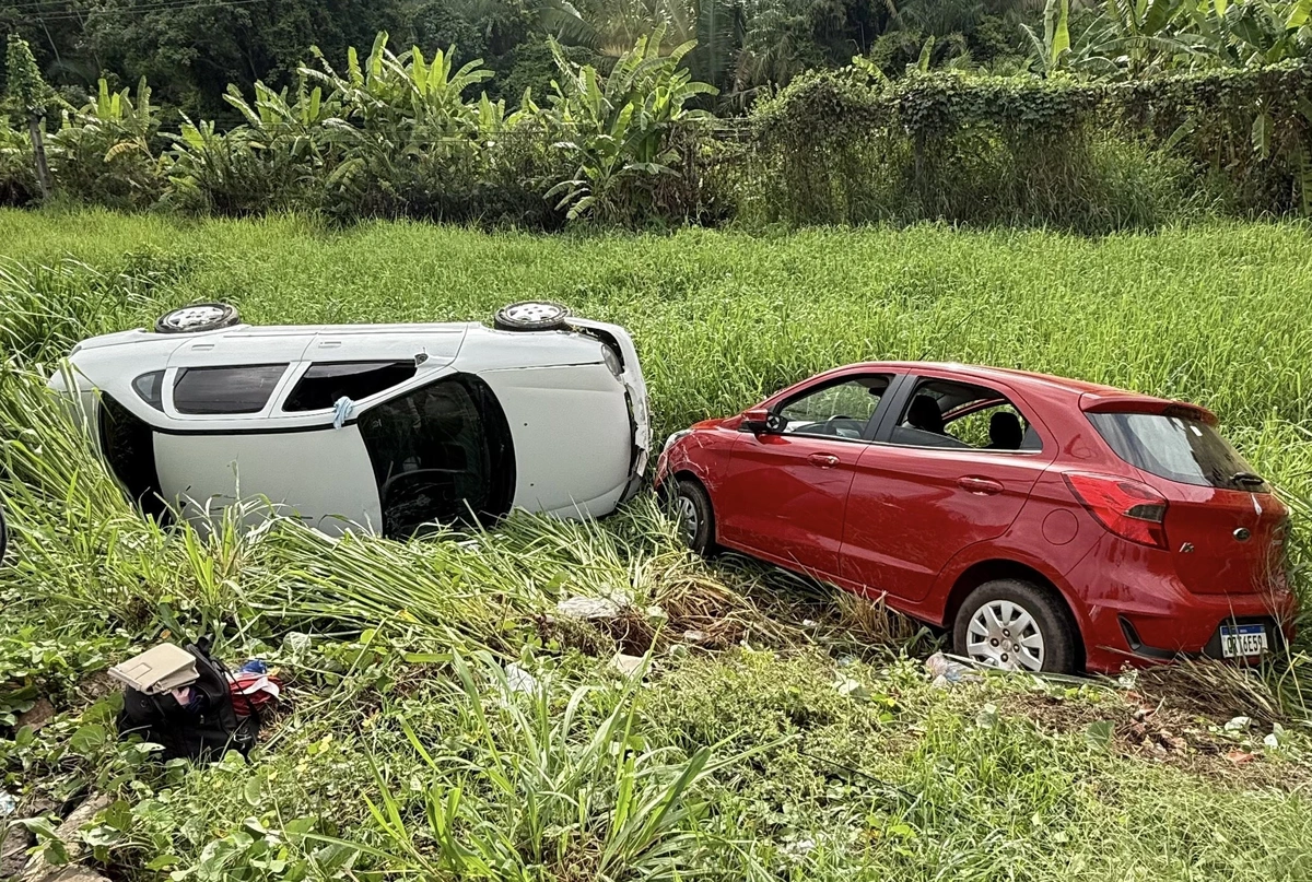 Dois veículos colidiram e acabaram descendo uma ribanceira às margens da rodovia, chamando a atenção de quem passava pelo local.