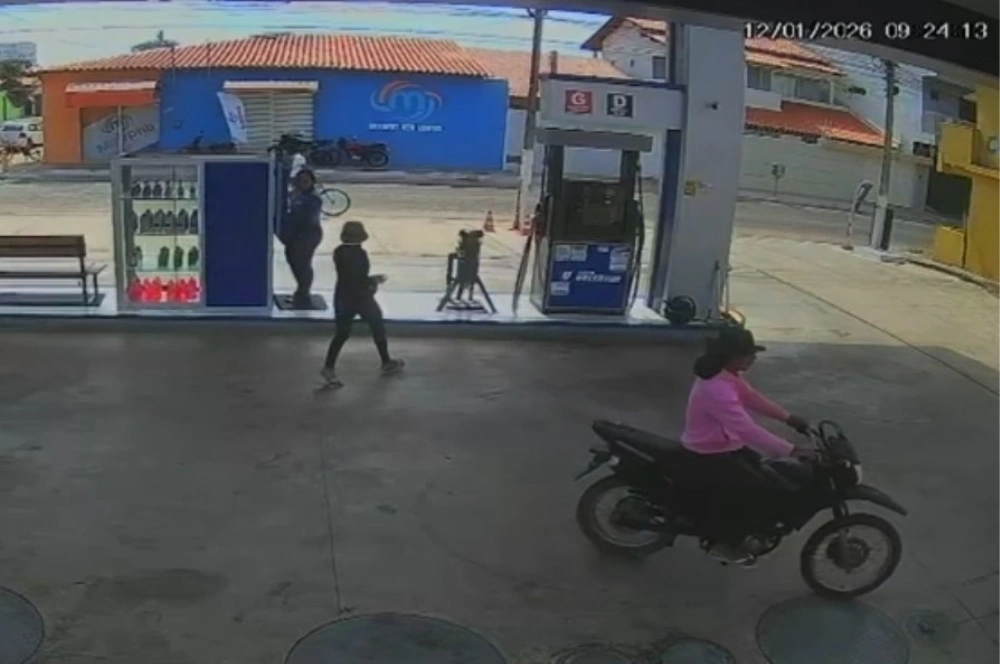 Nas imagens é possível ver os suspeitos chegando na motocicleta e abordando uma frentista que estava próximo a uma das bombas de abastecimento. A vítima tenta correr, porém os criminosos impedem e continuam o assalto.