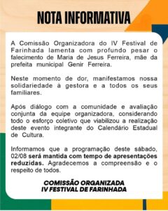 A Comissão Organizadora do IV Festival de Farinhada lamenta com profundo pesar o falecimento de Maria de Jesus Ferreira, mãe da prefeita municipal Genir Ferreira.
