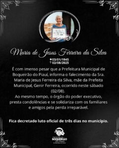 ▪️ NOTA DE PESAR▪️ | É com imenso pesar que a Prefeitura Municipal de Boqueirão do Piauí, informa o falecimento da Sra. Maria de Jesus Ferreira da Silva, mãe da Prefeita Municipal, Genir Ferreira, ocorrido neste sábado (02/08). Ao mesmo tempo, o órgão do poder executivo, presta condolências e se solidariza com os familiares e amigos pela perda irreparável. Fica decretado luto oficial de três dias no município.
