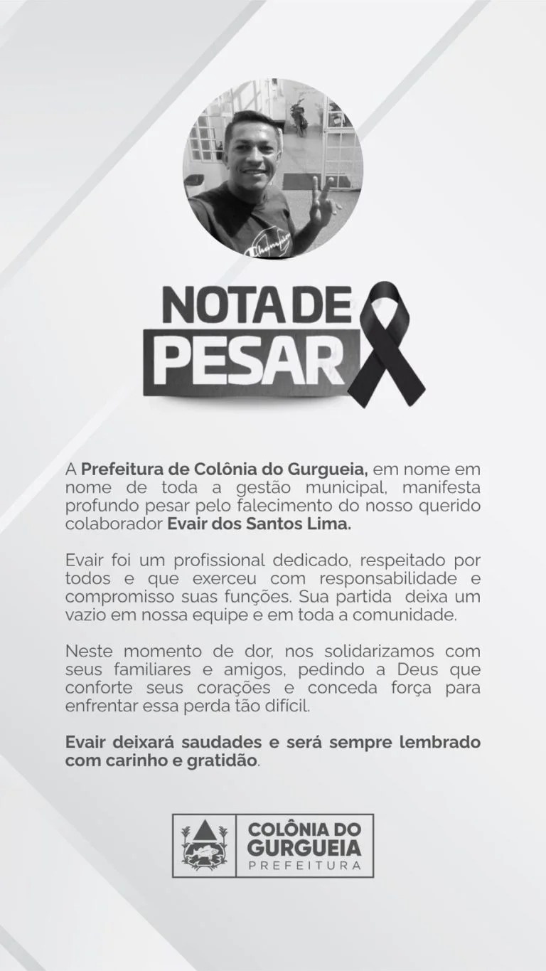 A Prefeitura de Colonia do Gurgueia, em nome de toda a gestão municipal, manifesta profundo pesar pelo falecimento do nosso querido colaborador Evair dos Santos Lima.