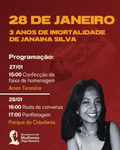 Para lembrar a data e cobrar respostas da justiça, o Movimento Olga Benario Brasil realiza, na tarde desta quarta-feira, um ato no Parque da Cidadania, em Teresina. A mobilização conta com roda de conversa e panfletagem, com foco no combate à violência contra a mulher e na denúncia da morosidade judicial em casos de feminicídio.